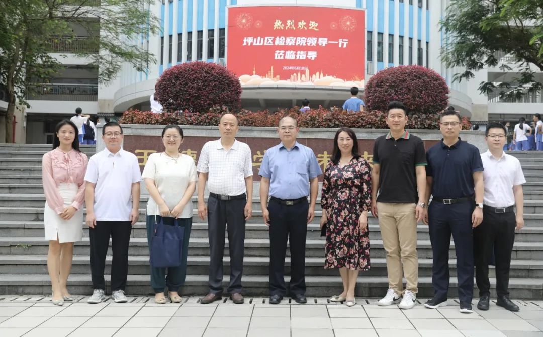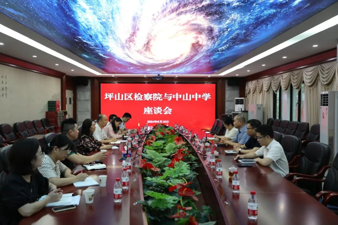 6月18日下午,坪山区检察院党组书记、检察长、坪山区中山中学法治副校长刘山泉率队前往巡展第一站——坪山区中山中学调研座谈,中山中学党总支书记何莹娟、校长梅越平及双方有关部门负责人参加活动。