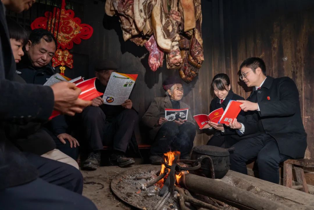 图②:在村民家里,法院干警和村民围坐在火炉旁,共话法治乡村建设。