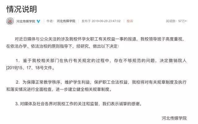 不过,到了29日晚,河北传媒学院又通过官方微博发布情况说明称,学校相关部门在执行有关规定的过程中,存在不够规范的问题,决定撤销相关文件,将对有关规章制度及执行和落实情况进行全面检查,进一步建立健全相关规章制度。