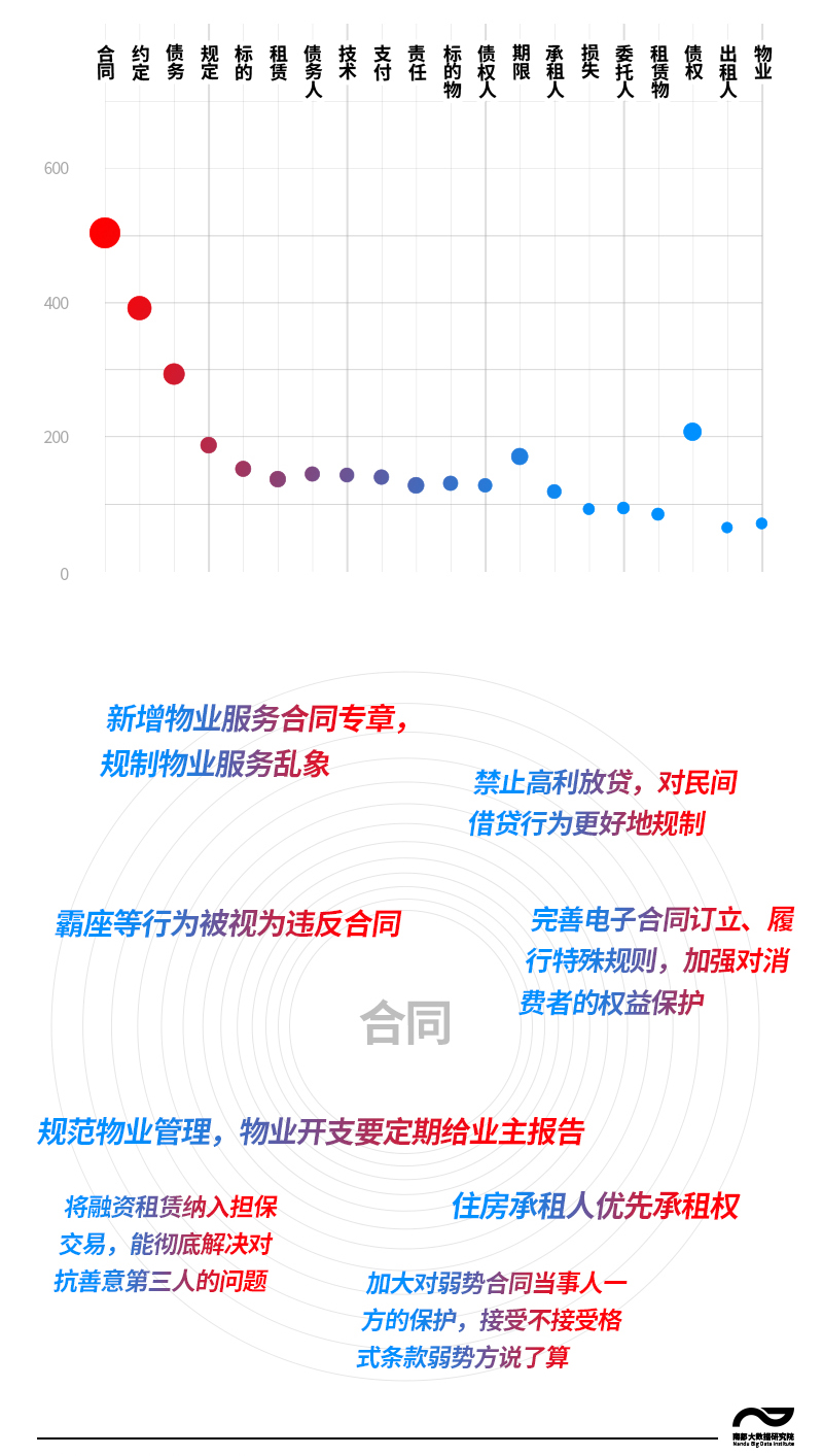 *数据来源:根据民法典全文梳理,圆圈大小代表合同编中该词出现次数多少,亮点为根据公开报道部分列举。