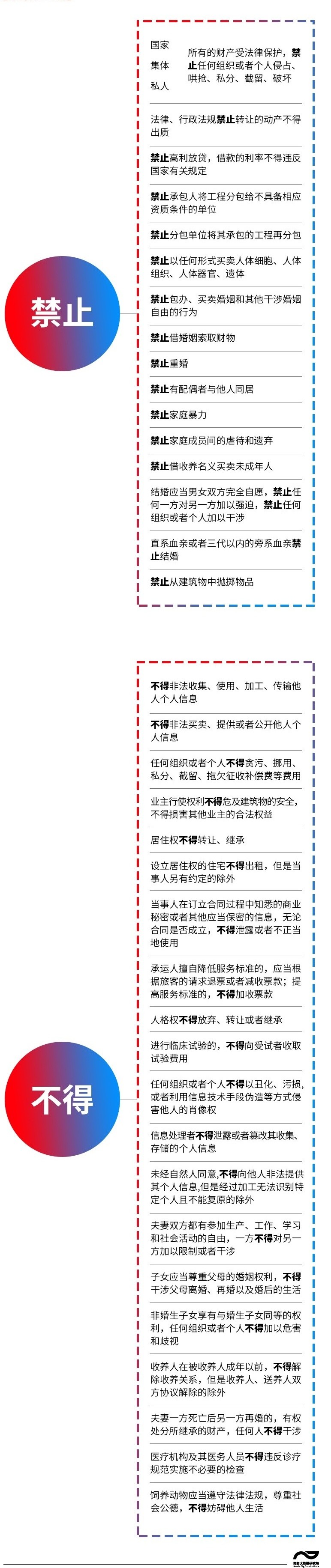 既“温柔”又“霸道”,民法典用周全的条文撑起“以人为本”的终极关怀,也用“禁止”“不得”等字眼,框定了法律红线。民法典全文中,“不得”出现195次,“禁止”出现24次,其中,有的为婚姻搭建守则,比如“禁止借婚姻索取财物”“禁止家庭暴力”“禁止包办、买卖婚姻和其他干涉婚姻自由的行为”;也有的为技术明确边界,比如“信息处理者不得泄露或者篡改其收集、存储的个人信息”“不得以丑化、污损,或者利用信息技术手段伪造等方式侵害他人的肖像权”。