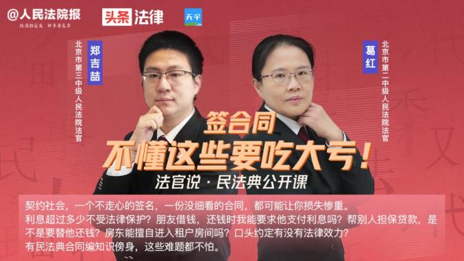 上述这些与合同相关的问题,29日晚上《法官说·民法典公开课》系列直播第四期作出解答。《法官说·民法典公开课》系列直播由人民法院报头条号、今日头条、天平阳光APP联合制作,本期到场的嘉宾是北京市第二中级人民法院法官葛红和北京市第三中级人民法院法官郑吉喆。