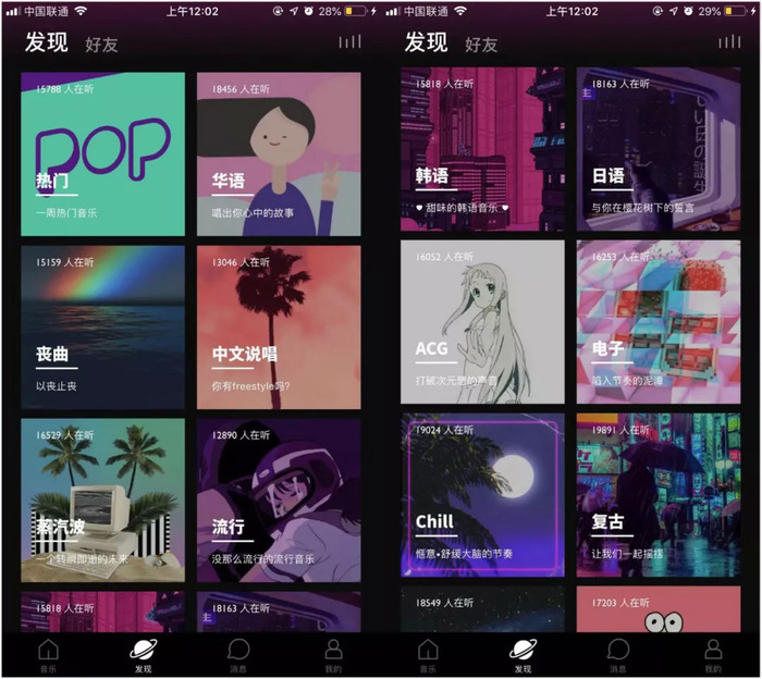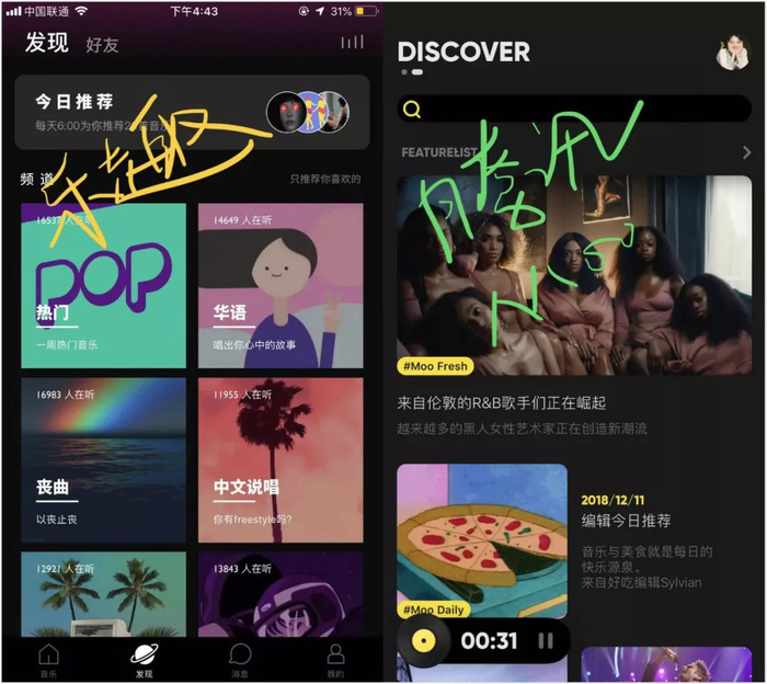 MOO的发现页设计更为大胆,除了常规的编辑推荐,音乐打破了品类推荐的传统模式,通过个性标签的设置,比如音乐灵感、Aforbeat、Moo friends等,来推荐风格一致的音乐。在App Store上拿了4.5分,大部分都是好评,部分用户指责MOO抄袭乐趣和抖音。