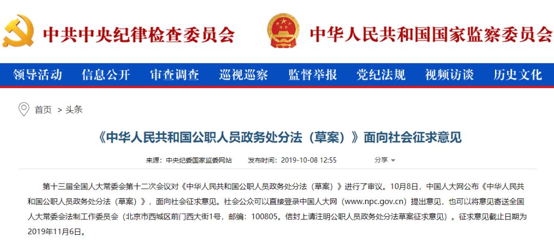 第十三届全国人大常委会第十二次会议对《中华人民共和国公职人员政务处分法(草案)》进行了审议。10月8日,中国人大网公布《中华人民共和国公职人员政务处分法(草案)》,面向社会征求意见。社会公众可以直接登录中国人大网()提出意见,也可以将意见寄送全国人大常委会法制工作委员会(北京市西城区前门西大街1号,邮编:100805。信封上请注明公职人员政务处分法草案征求意见)。征求意见截止日期为2019年11月6日。