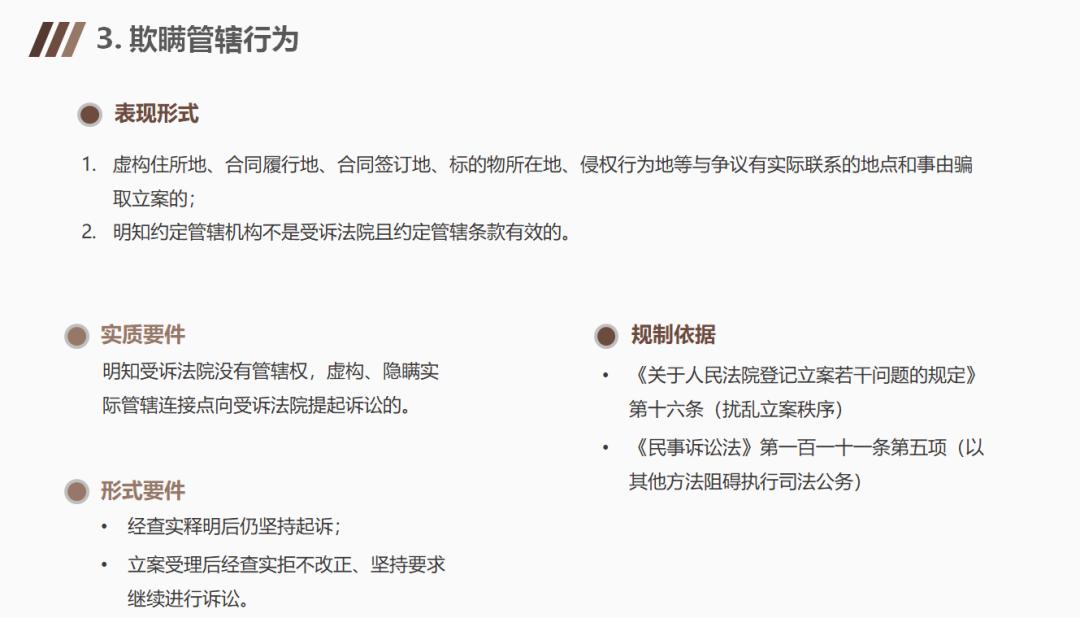 (1)采取编造虚构、隐瞒真实信息、故意提供无效信息等方式,骗取法院立案、导致法院错误送达或遗漏、错列必要共同诉讼人;