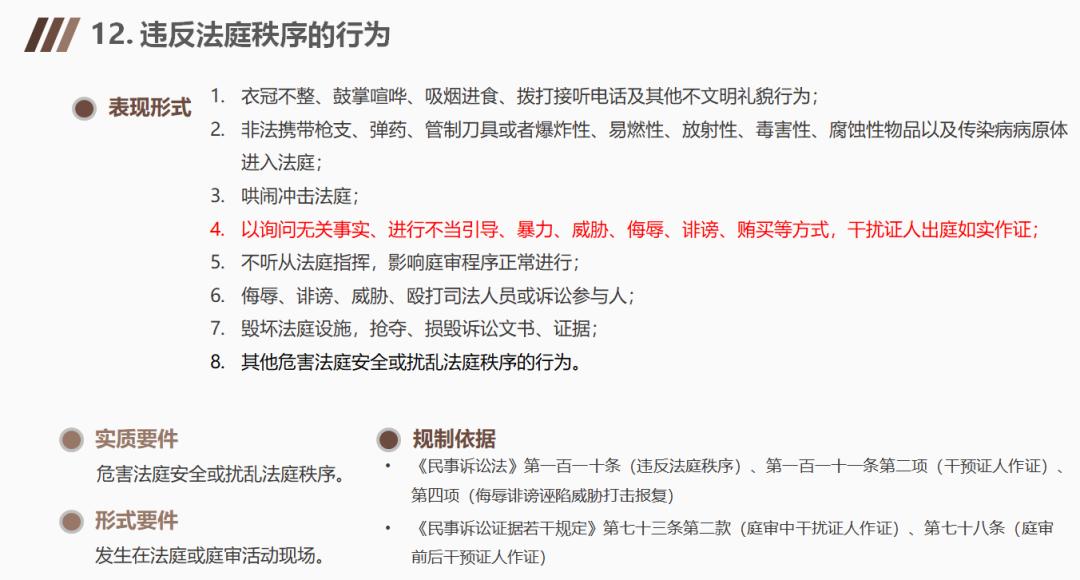 《民事诉讼法》第一百一十条(违反法庭秩序)、第一百一十一条第二项(干预证人作证)、第四项(侮辱诽谤诬陷威胁打击报复);