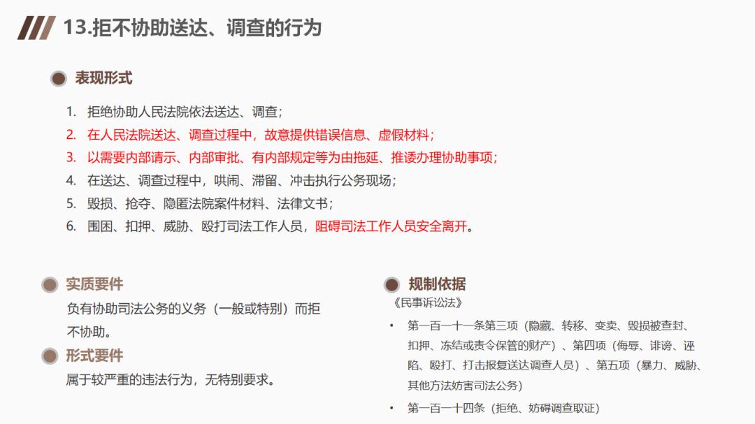 (16)以伪造证据、暴力、威胁或者其他方法阻碍司法人员实施查询、查封、扣押、冻结、划拨、拍卖、变卖财产等执行行为的(含诉讼保全);