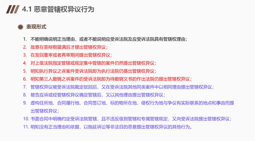 (11)明知没有正当理由和依据,以拖延诉讼等非法目的恶意提出管辖权异议的其他行为。