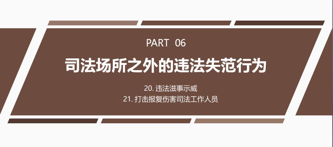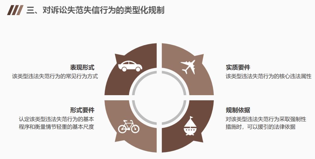 下面,我就结合思明法院工作指引的具体内容,对各类违法失范行为的表现形式、实质要件、形式要件和规制依据做个粗略的介绍。其中,表现形式是该违法失范行为的常见行为方式,以便直观地识别该行为;实质要件是该违法失范行为的核心违法属性,以便于在表现形式不能穷尽所有行为方式时,明确如何判断该行为是否构成违法失范;形式要件是认定违法失范行为的基本程序和衡量情节轻重的基本尺度;规制依据是对违法失范行为采取强制性措施时,可以援引的规范性依据。