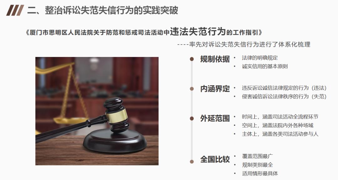 为了解决上述问题,厦门市思明区人民法院率先对诉讼失范失信行为进行了体系化梳理,制定了《关于防范和惩戒司法活动中违法失范行为的工作指引》。《工作指引》从法律的明确规定和诚实信用的基本原则这两方面的规制依据切入,将诉讼失范失信行为的内涵准确界定为“违反诉讼诚信法律规定、侵害诚信诉讼法律秩序的行为”,并进一步通俗化为“违法失范行为”;对违法失范行为的外延,《工作指引》在时间维度上涵盖了司法活动全流程环节,在空间维度上涵盖了法院内外各种场域,在主体维度上涵盖了各类司法活动参与人。通过检索发现,该指引目前是在全国法院范围内,对诉讼失范失信行为覆盖范围最广、规制类别最全、适用情形最具体的规范性文件。