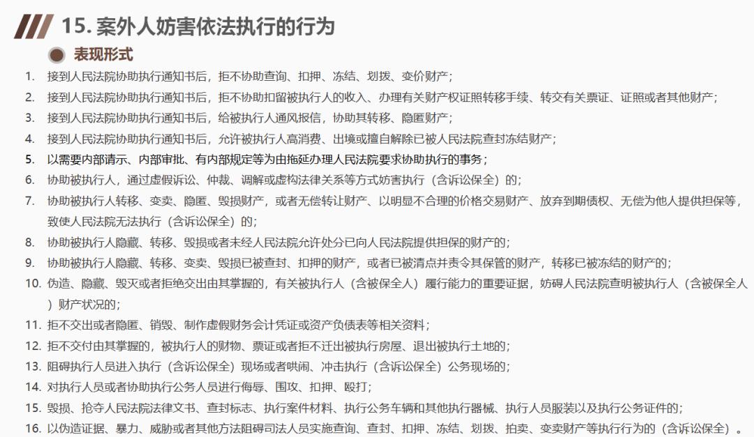 (5)以需要内部请示、内部审批、有内部规定等为由拖延办理人民法院要求协助执行的事务;