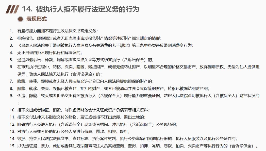 (15)以伪造证据、暴力、威胁或者其他方法阻碍司法人员实施查询、查封、扣押、冻结、划拨、拍卖、变卖财产等执行行为的(含诉讼保全)。