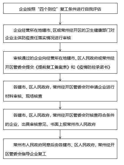 第二步:审核批准。各辖市、区人民政府,常州经开区管委会对申请企业进行材料审核→各辖市、区人民政府,常州经开区管委会对材料齐全的企业进行现场核查→各辖市、区人民政府,常州经开区管委会对核查符合条件的,尽快出具审核意见,书面上报常州市人民政府→常州市人民政府同意后由各辖市、区人民政府,常州经开区管委会指导企业复工。