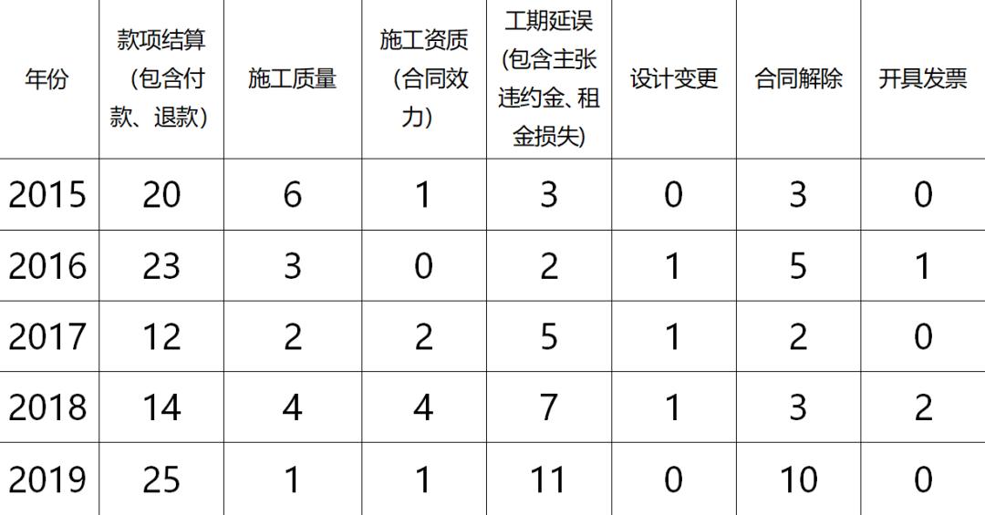 2015—2019年我院已经审结的装饰装修合同纠纷件,其中判决138件,上诉43件,调解104件,撤诉130件,其他方式结案7件。