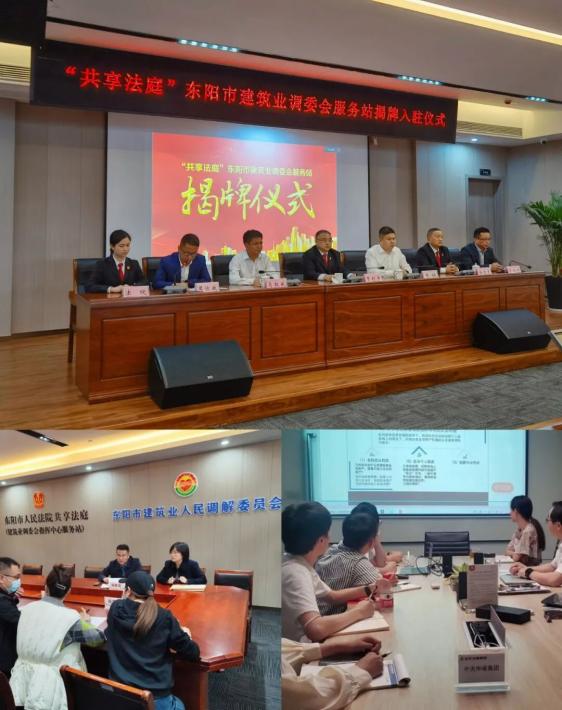 近几年,随着市场环境变化,建筑业面临着一系列挑战,涉诉纠纷数量呈“爬坡”式上升。基于此,2022年5月,我院携手东阳市住建局、东阳市司法局、金华律协房地产建筑行业协会设立共享法庭(建筑业调委会指挥中心服务站),汇聚专业调解力量入驻东阳市建筑业服务中心,并以其为基站不断延伸司法服务“藤蔓”,在多家建筑企业、多个风险楼盘设立分支服务点,将优质高效便捷的司法服务下沉到企业“家门口”,强力推进东阳建筑业高质量发展。截至2023年11月,建调委指挥中心服务站共办结诉前纠纷2245件,调解成功率38.39%,标的额达7.53亿元。