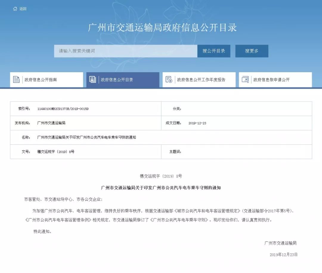 答:广州市交通运输局(原广州市交通委员会)于2009年牵头制定了《广州市公共汽车电车乘车守则》(以下简称《乘车守则》),并于2014年进行了第一次修订。目前适用的《乘车守则》将于2019年12月25日到期失效。