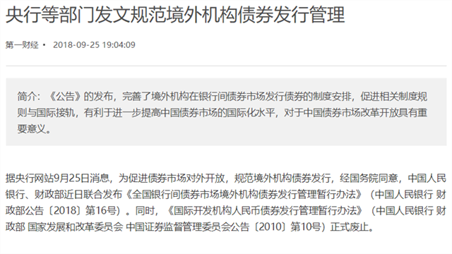 为了促进全国银行间债券市场对外开放,规范境外机构债券发行,保护债券市场投资者合法权益,去年9月25日,中国人民银行、财政部联合发布《全国银行间债券市场境外机构债券发行管理暂行办法》。进一步明确了境外发行人在中国的银行间市场发行熊猫债政策的框架。