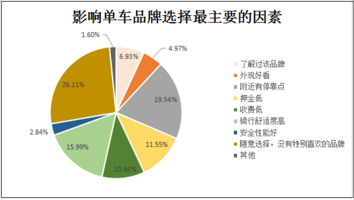 调查中,19.54%的消费者在选择单车品牌时主要的依据是附近有停靠点,便利是选择单车的第一依据。但即使如此,仍19.63%的消费者认为高峰期单车数量短缺