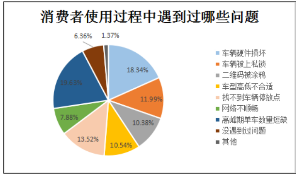 与此同时,共享单车的乱停放现象同样带来了其他城市问题,比如扔倒在路边、停放到楼道内、占用盲道、占用公共自行车车桩位置等。此外,诸如硬件损坏、二维码损毁、车胎损坏、刹车失灵、链条坏了等现象也较为常见。18.34%的消费者遇到过车辆硬件损坏的问题,11.99%遇到过车辆被上私锁,10.38%遇到过二维码被涂鸦的问题。