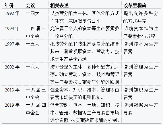 回顾我国改革开放历程,收入分配制度改革是贯穿始终的核心命题。中国结合社会主义初级阶段条件下以公有制为主体、多种经济成分并存的所有制结构特点,提出按劳分配为主,多种分配方式并存的渐进改革思路,既遵循了马克思主义基本分配原则,又从社会主义市场经济规律出发,体现市场经济发展中的竞争机制、效率原则。在这一过程中,党中央根据不同阶段经济发展特点,逐次将资本、技术、管理、知识和数据等纳入按要素分配的序列之中(如表1)。