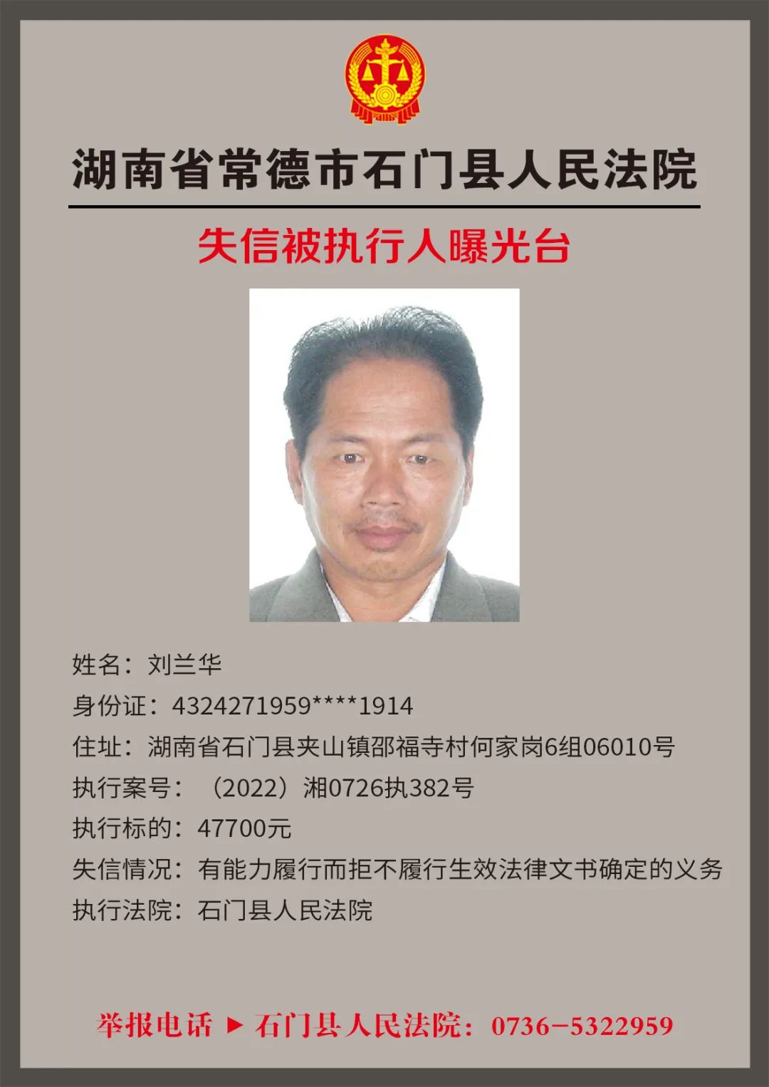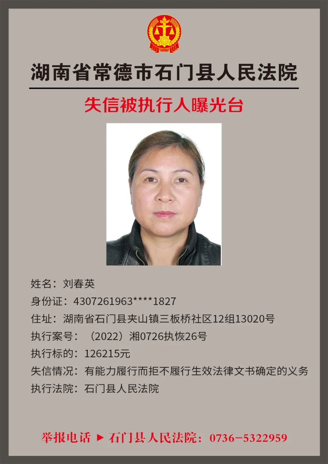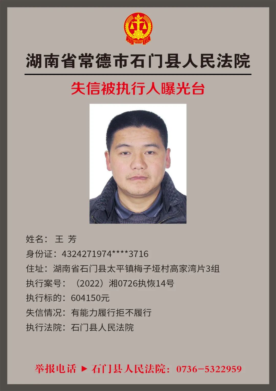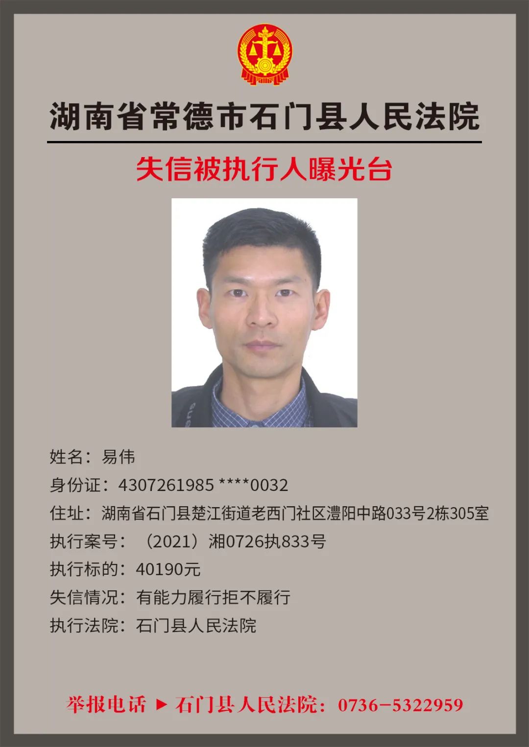 为推进社会诚信体系建设,营造惩戒失信、褒奖诚信的社会氛围,创造稳定、公平、透明、可预期的营商环境,根据《最高人民法院关于公布失信被执行人名单信息的若干规定》,石门法院会相继发布失信被执行人名单,本次为2022年第四轮曝光的失信被执行人,旨在加强对失信被执行人信用监督、威慑和惩戒。
