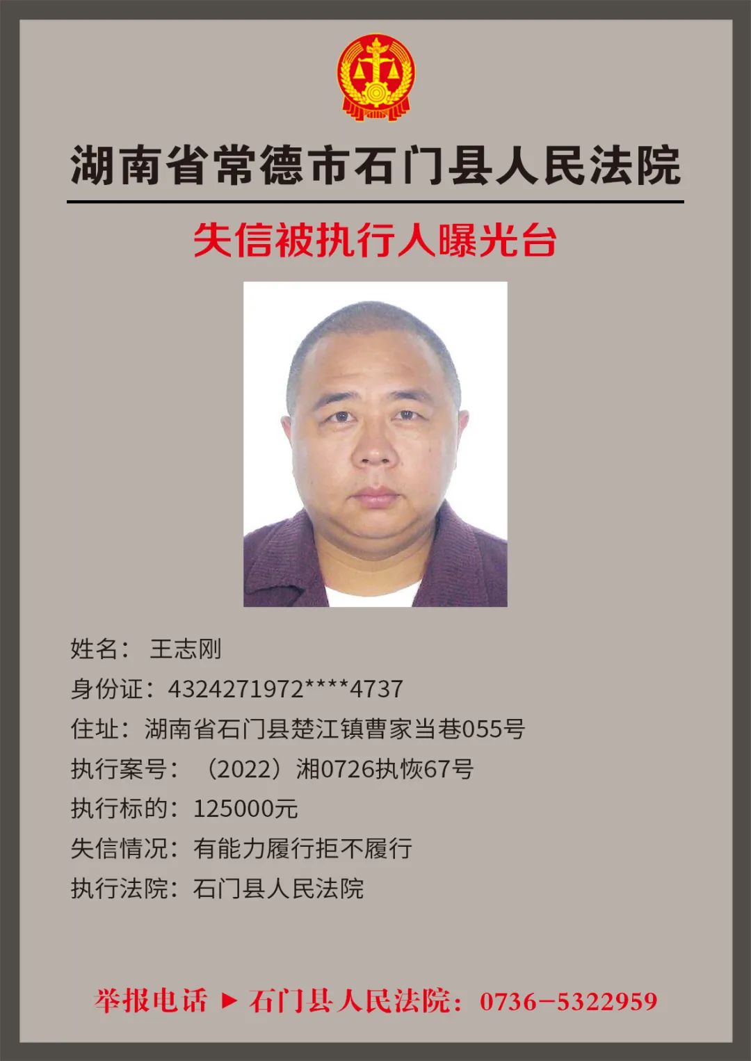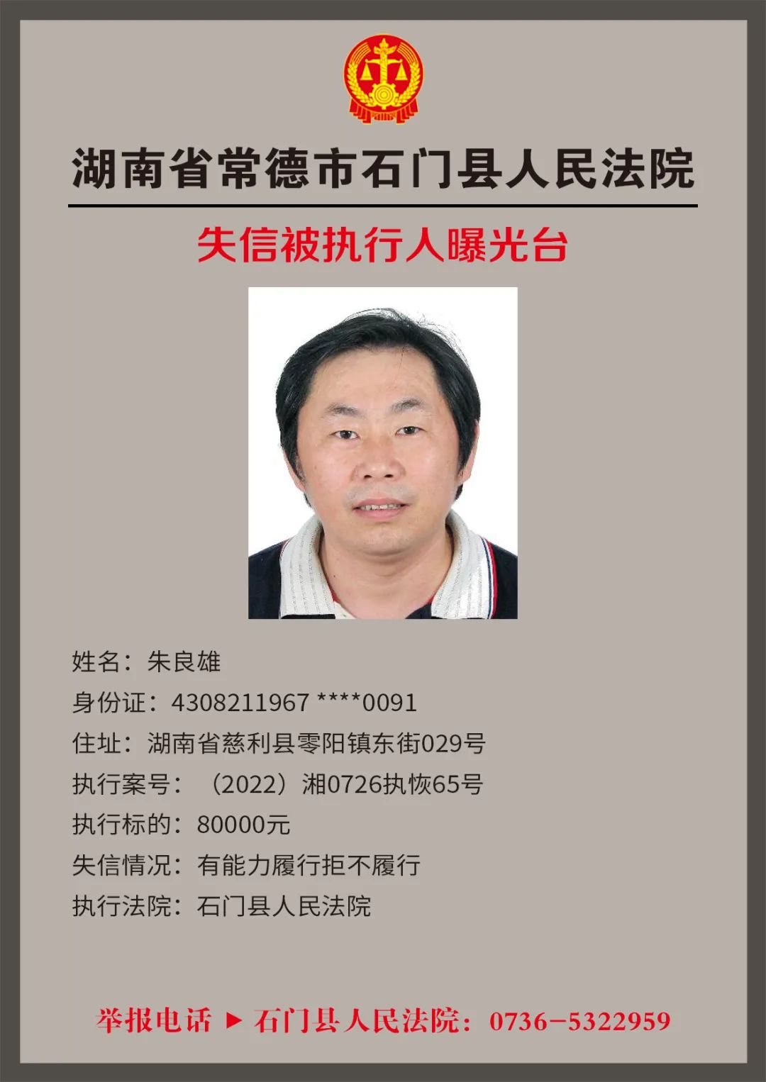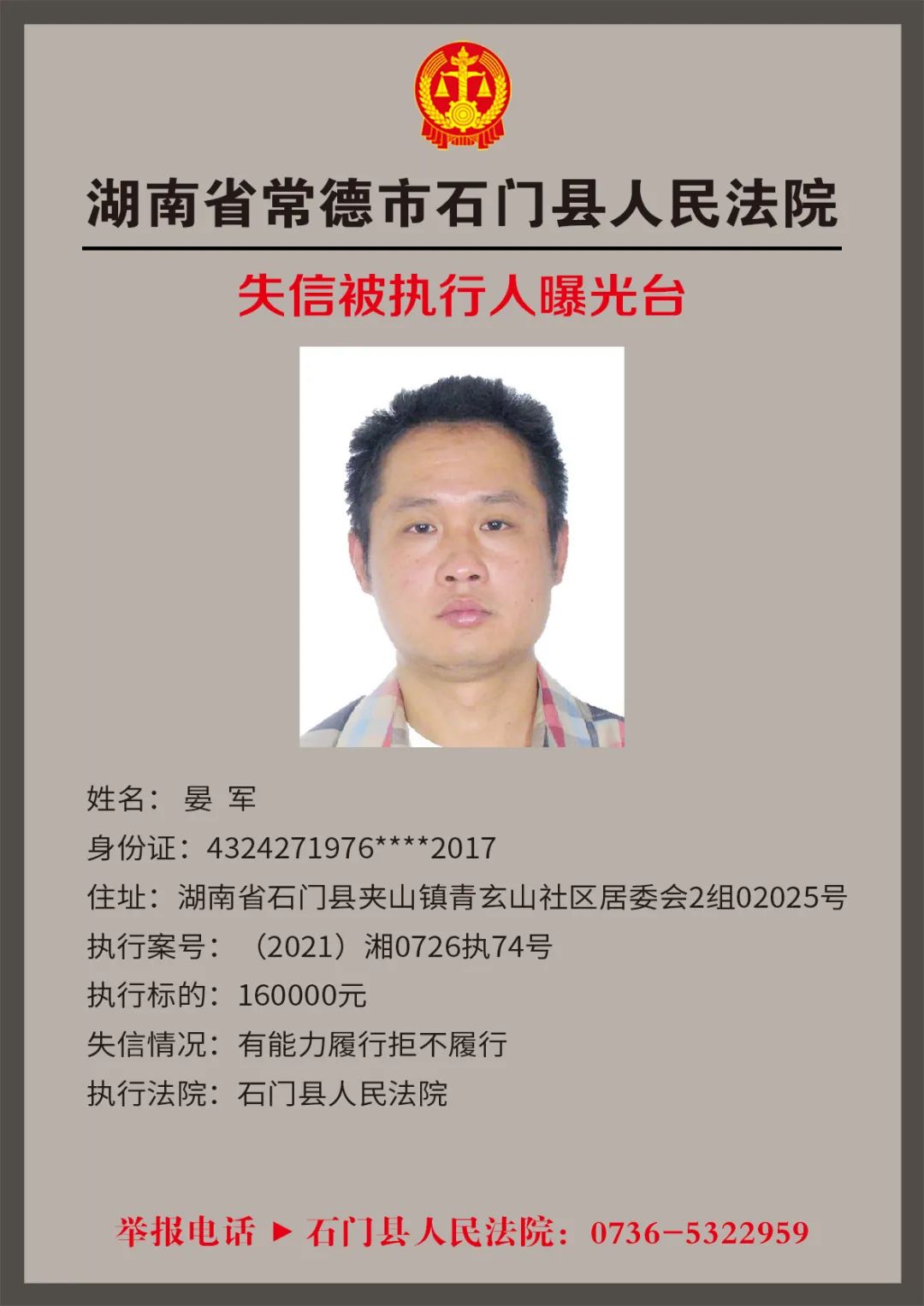 为推进社会诚信体系建设,营造惩戒失信、褒奖诚信的社会氛围,创造稳定、公平、透明、可预期的营商环境,根据《最高人民法院关于公布失信被执行人名单信息的若干规定》,石门法院会相继发布失信被执行人名单,本次为2022年第四轮曝光的失信被执行人,旨在加强对失信被执行人信用监督、威慑和惩戒。