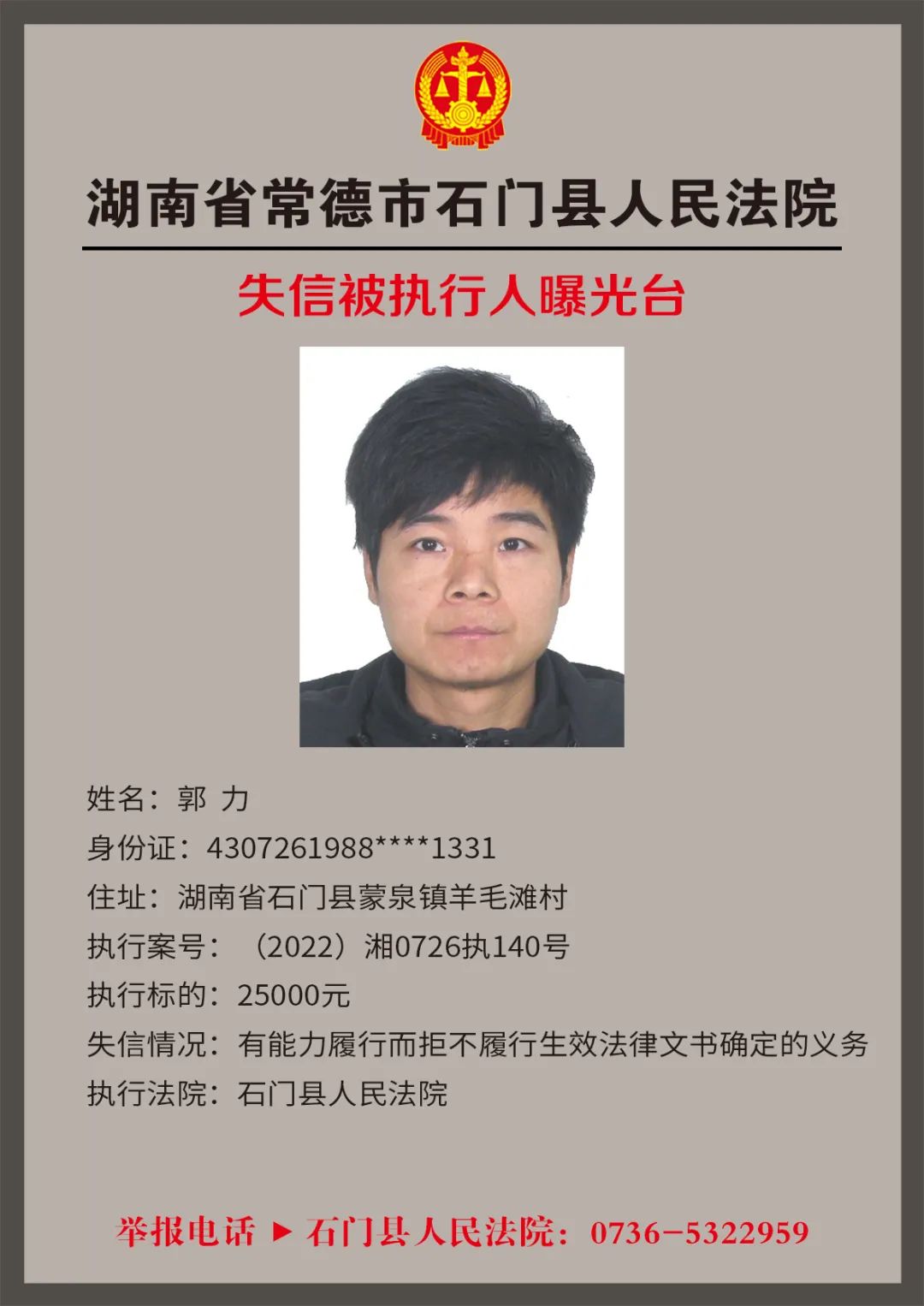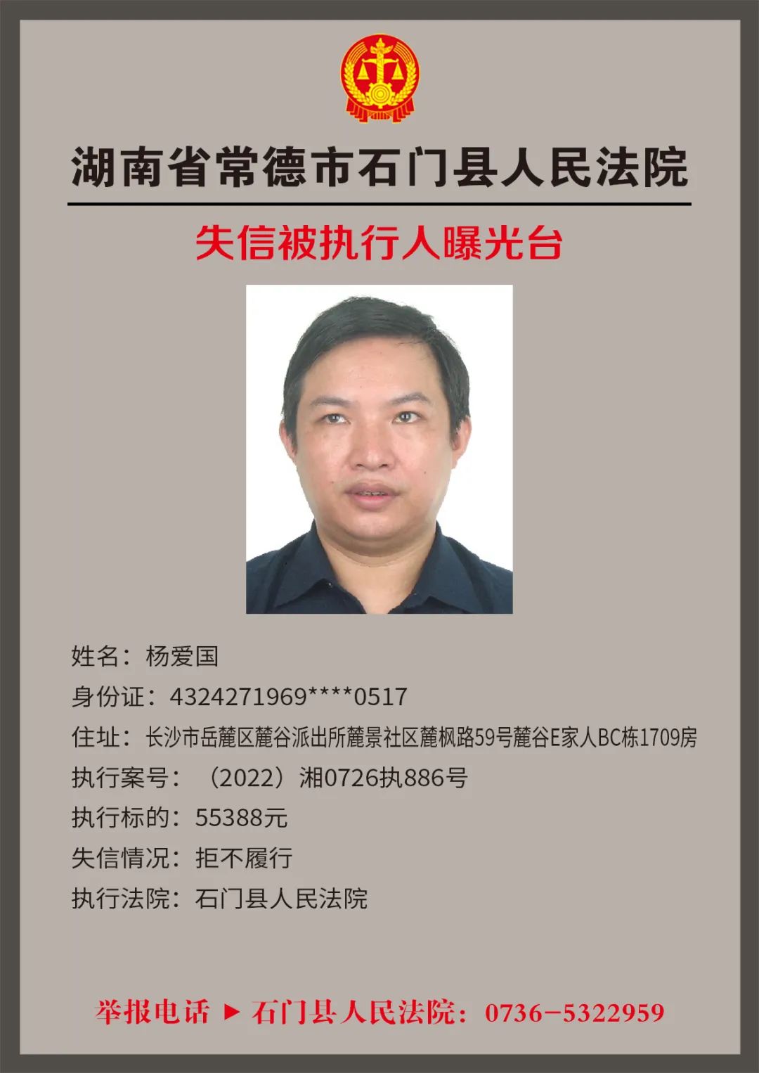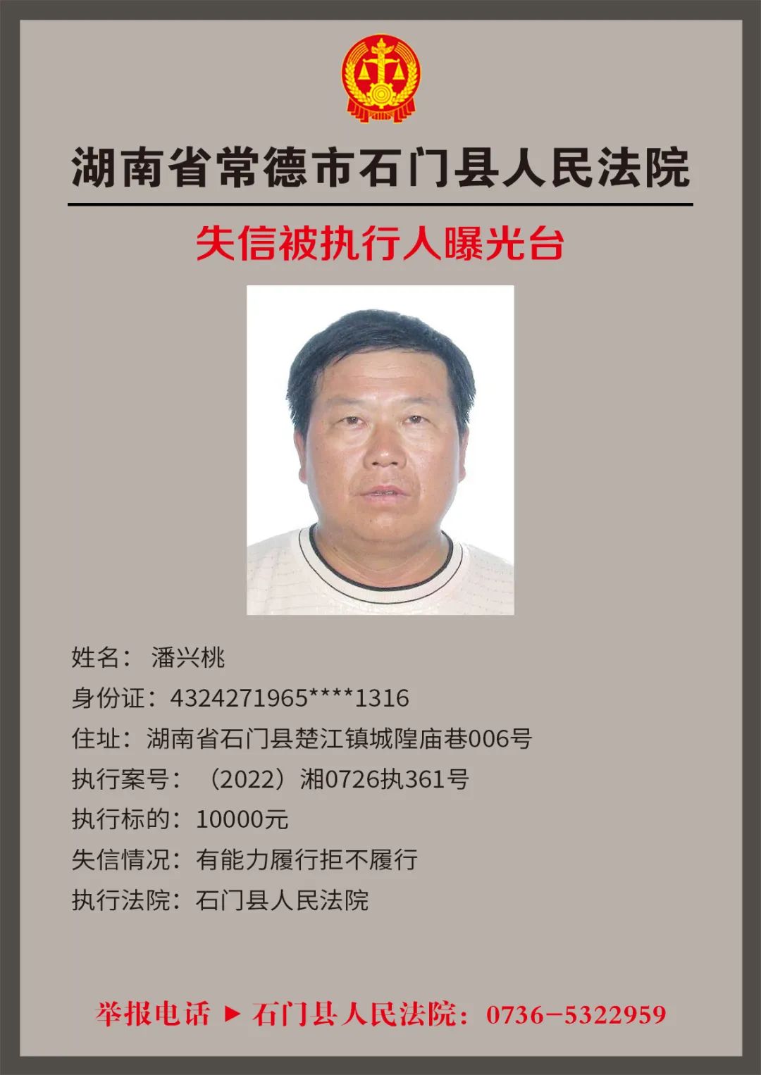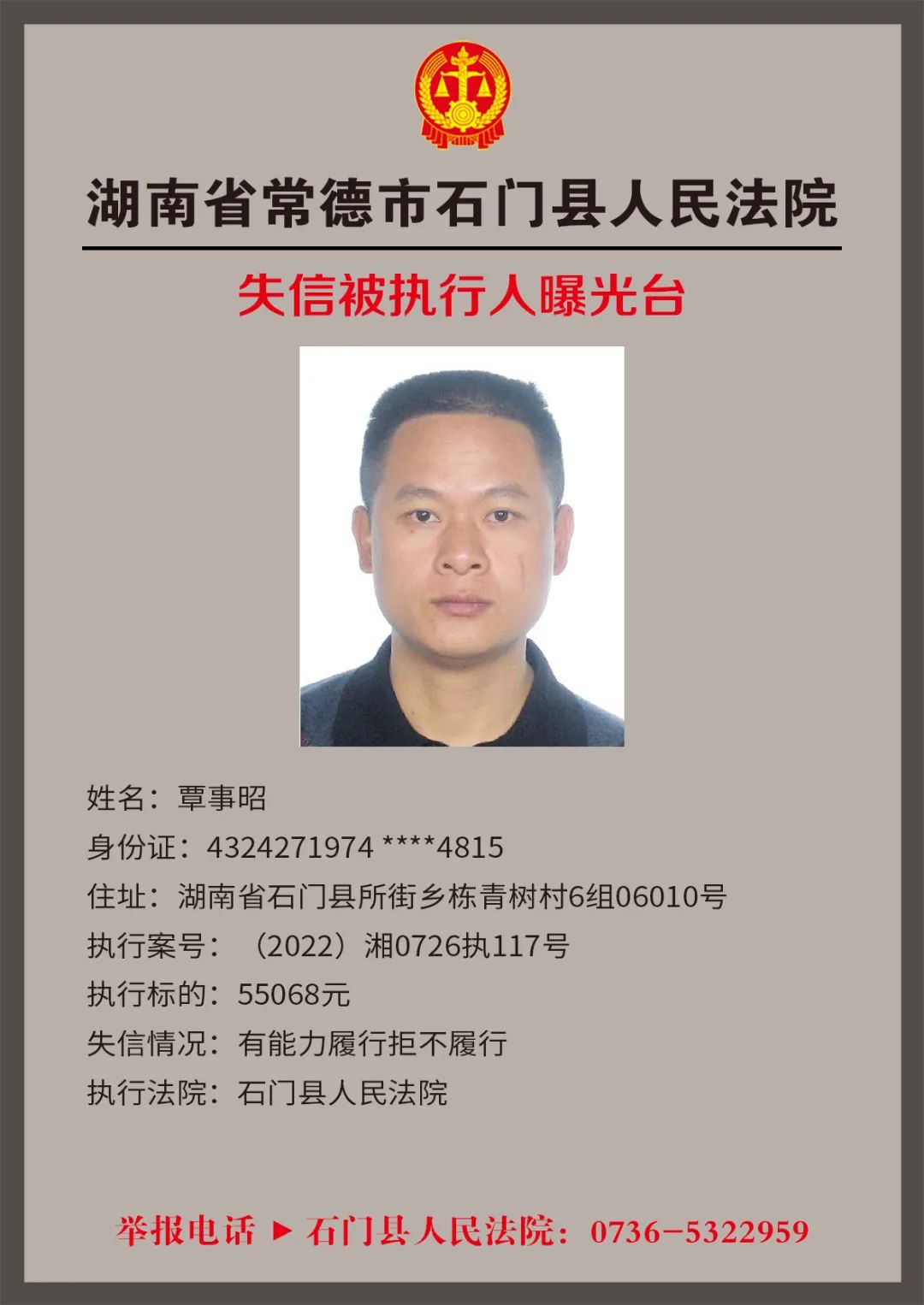 为推进社会诚信体系建设,营造惩戒失信、褒奖诚信的社会氛围,创造稳定、公平、透明、可预期的营商环境,根据《最高人民法院关于公布失信被执行人名单信息的若干规定》,石门法院会相继发布失信被执行人名单,本次为2022年第四轮曝光的失信被执行人,旨在加强对失信被执行人信用监督、威慑和惩戒。