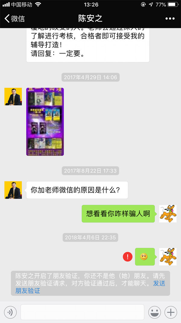 前几天,网上热传一红木销售同学与某“成功大师”的微信聊天记录,最后,“大师”崩溃的删除了该红木销售同学的微信号。其实冒充大师的微信号也加过我,由于自己缺乏耐心,只回复了一句“想看看你怎么骗人”就被对方毫不留情的删除了好友。