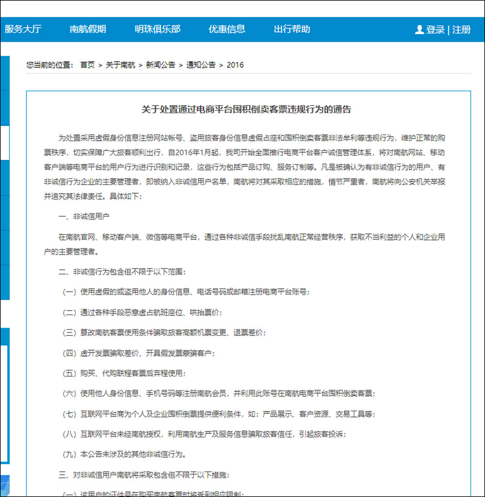 这种虚假购票、恶意占座行为航空公司普遍都遭遇过。南方航空公司在2016年1月就对外公告称,对于囤积倒卖客票违规行为将被纳入非诚信用户名单,并对其采取相应的措施。
