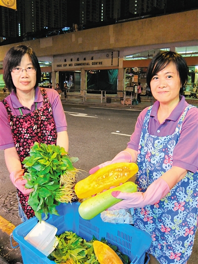 香港环保团体志愿者到菜市场收集“剩菜”,整理后分发给有需要的市民。