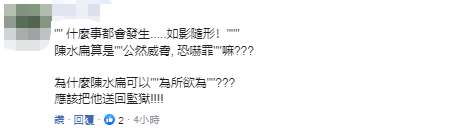 也有网友说,“陈水扁算是‘公然威胁,恐吓罪’吗?为什么陈水扁可以‘为所欲为’?应该把他送回监狱!” ↓