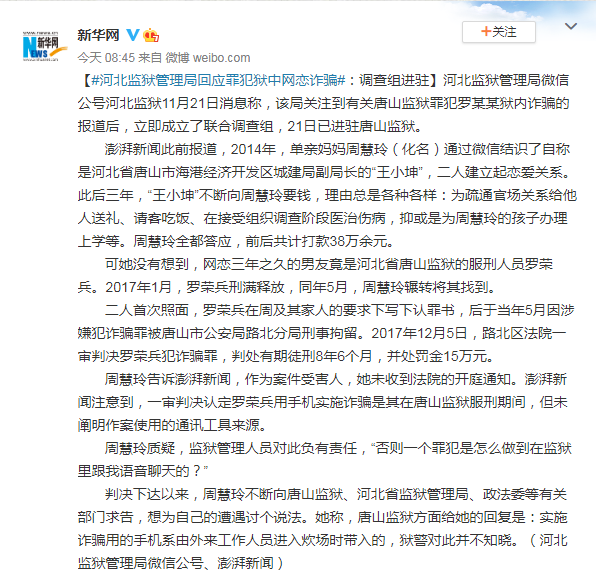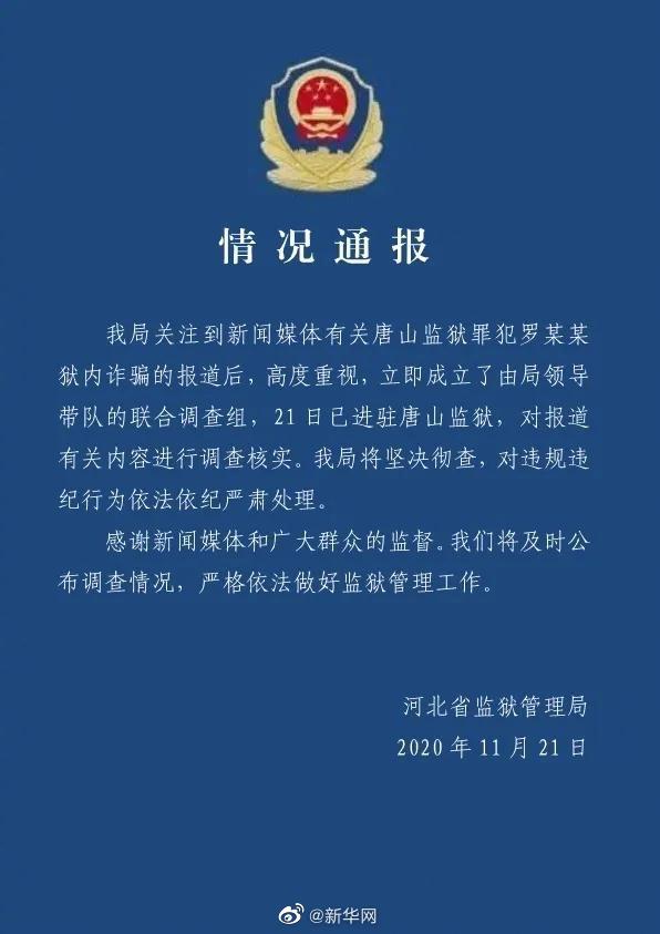 河北监狱管理局微信公号河北监狱11月21日消息称,该局关注到有关唐山监狱罪犯罗某某狱内诈骗的报道后,立即成立了联合调查组,21日已进驻唐山监狱。