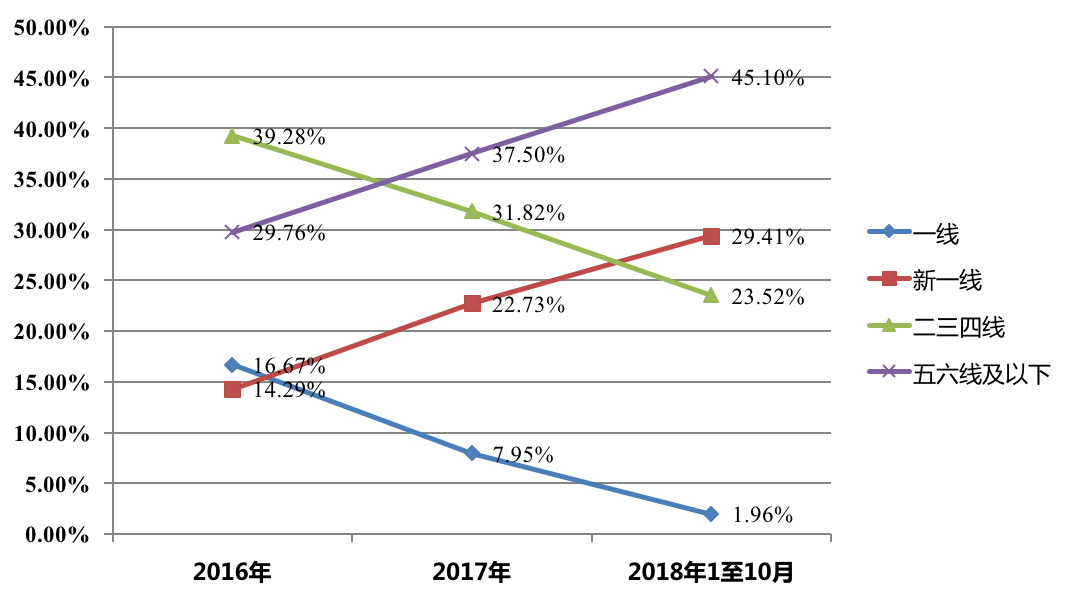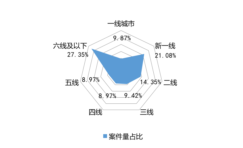 从案件城市分布来看,呈现两极化特点,新一线大中城市和六线及以下小城市合计占比近五成。具体分析,在公交车司乘纠纷刑事案件中,按照城市经济发展水平分类,案件量占比为:一线城市(9.87%),新一线城市(21.08%),二线城市(14.35%),三线城市(9.42%),四线城市(8.97%),五线城市(8.97%),六线城市及以下(27.35%)。一线和二三四线城市案件量下降趋势明显,新一线和五六线及以下城市增长趋势明显。