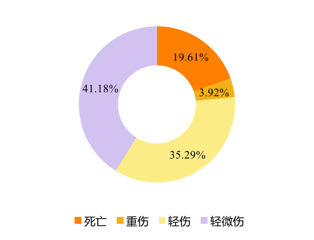 记者注意到,公交车行驶中司乘冲突刑事案件中,38.68%的案件中有人员伤亡的情况。在有伤亡的案件中,各类伤势人数及占比分别为:死亡(19.61%),重伤(3.92%),轻伤(35.29%),轻微伤(41.18%)。