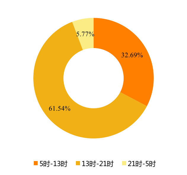 在公交车行驶中的司乘冲突刑事案件中,从发生时间来看,约六成案件发生在13时后和21时前。