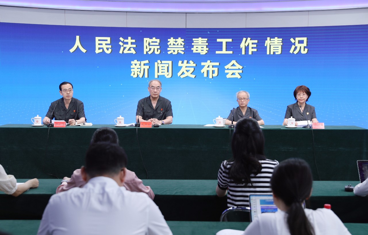 在第37个“6·26”国际禁毒日来临之际,最高人民法院于6月25日举行新闻发布会,通报人民法院去年以来禁毒工作基本情况,并发布10件相关典型案例。最高人民法院刑五庭庭长李睿懿、刑五庭副庭长欧阳南平、民一庭副庭长蔡金芳出席发布会并回答记者提问,发布会由最高人民法院新闻局副局长姬忠彪主持。
