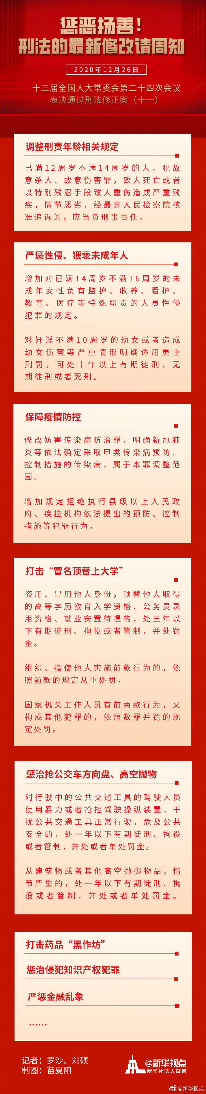 12月26日,据新华社报道,十三届全国人大常委会第二十四次会议表决通过刑法修正案(十一),将于2021年3月1日起施行。