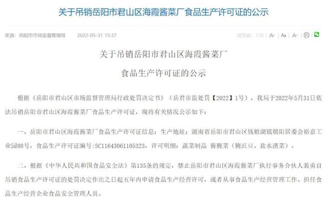 岳阳市市场监督管理局官网信息显示,5月31日,岳阳市市场监督管理局依法吊销岳阳市君山区海霞酱菜厂食品生产许可证,并禁止岳阳市君山区海霞酱菜厂执行事务合伙人裴勇自吊销食品生产许可证的处罚决定作出之日起五年内申请食品生产经营许可,或者从事食品生产经营管理工作、担任食品生产经营企业食品安全管理人员。
