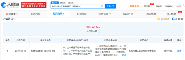 天目新闻讯 6月24日,天眼查App显示,央视315晚会曝光的“土坑酸菜”涉事加工企业岳阳市君山区海霞酱菜厂(普通合伙)日前因生产标签不符合规定的食品、未按规定实施生产过程控制、从事虚假商业宣传,被岳阳市君山区市场监督管理局罚款109.46万元,并没收违法所得200元。