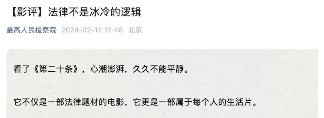 2月12日,最高检又发布署名为北京市人民检察院第一检察部副主任、三级高级检察官刘哲的影评《法律不是冰冷的逻辑》。