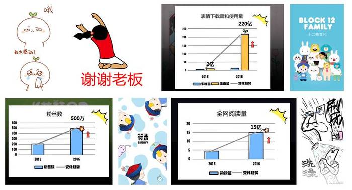 从15年到16年,所有表情发送量突破200亿,下载量突破8亿;粉丝已经突破500万,全网(可查)阅读量15亿。这只是一部分形象,对我们来说,长草颜团子和制冷少女只是实验市场的一部分产品,之后会有更多形象。