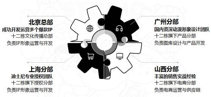 我个人感觉国内形象IP产业链这块是不全的,大家多在单点奋斗,有做形象的、有做产品的,如我们在广州发现有些做产品很不错的公司,但他们并没有再往前端操作。十二栋希望有更强的把控性,当你在产业链的每个点都有很强的话语权时,你才可以对一些品牌说不。