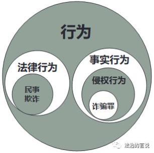 很明显,法律行为与事实行为之间是互相排斥的对立关系。民事欺诈和诈骗罪也是对立关系,而非特殊与一般的关系。
