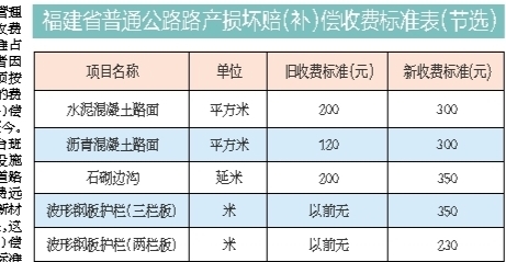 本报讯 (记者陈淑华 通讯员唐燕群 陈盛妹 廖启煌)广大司机朋友们注意啦!本月1日起,根据福建省物价局、福建省财政厅、福建省交通运输厅3个部门联合下发的通知,我市公路路产损坏的赔(补)偿收费标准做出调整。目前市公路局各分局正按照要求办理相关收费变更许可手续,待手续和相关配套设备完善后,即按照新标准收取公路路产损坏赔(补)偿费用。