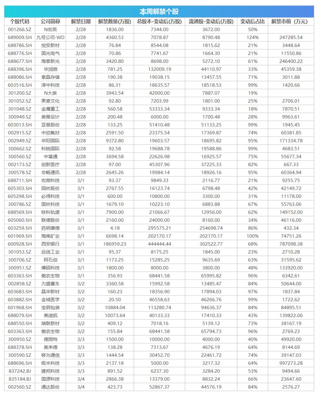 Wind数据显示,本周共计有46股迎来解禁,合计解禁市值约373亿元。其中,有两股解禁市值超50亿元,分别为极米科技(99.73亿元)以及西安银行(78.71亿元),尾随其后的还有九号公司、海泰新光、华阳国际等股。