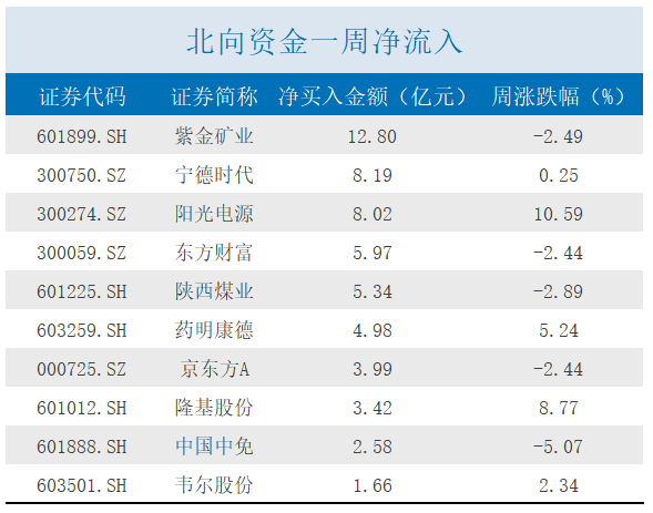 净买入额居前三的是紫金矿业、宁德时代、阳光电源,净买入额分别是12.80亿元、8.19亿元、8.02亿元。