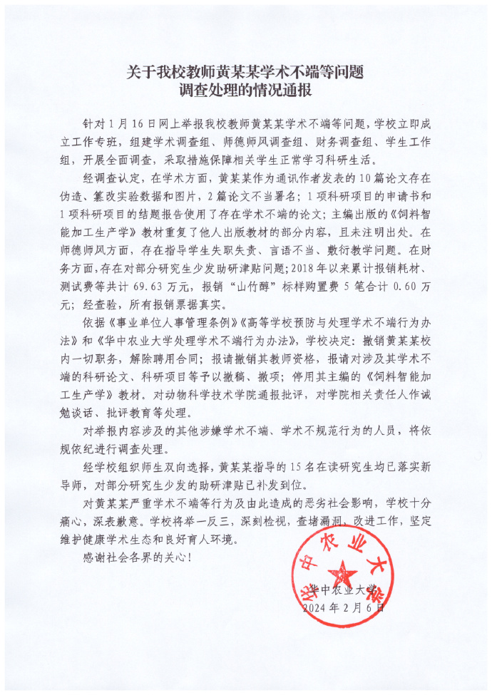 2月6日,华中农业大学通报教师黄某某学术不端等问题调查处理情况。学校决定:撤销黄某某校内一切职务,解除聘用合同;报请撤销其教师资格,报请对涉及其学术不端的科研论文、科研项目等予以撤稿、撤项;停用其主编的《饲料智能加工生产学》教材。