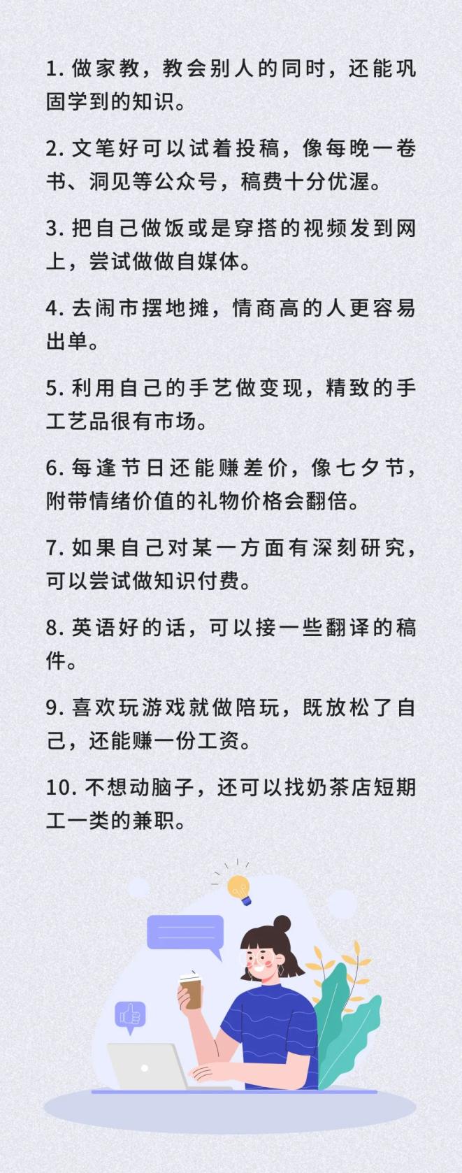 那么我建议你,可以找一份力所能及的兼职,在历练自己的同时,还能攒下一笔储蓄金。