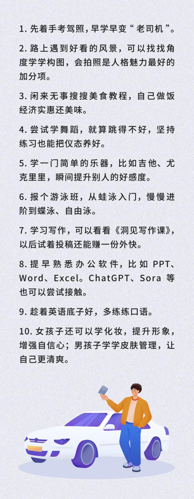 但现在,紧张的学习生涯暂时告一段落,你可以尽情去尝试新事物。