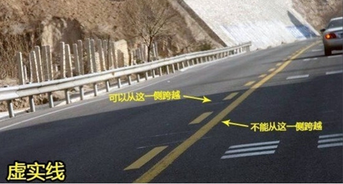 ③黄色虚实线:一条是黄色实线、一条是黄色虚线,虚线在哪一侧,那一侧的车辆就可以从此处临时跨越,比如超车或者转弯。